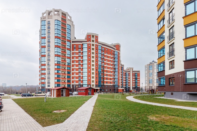 Детская площадка во дворе многоэтажного жилого дома на фоне голубого неба