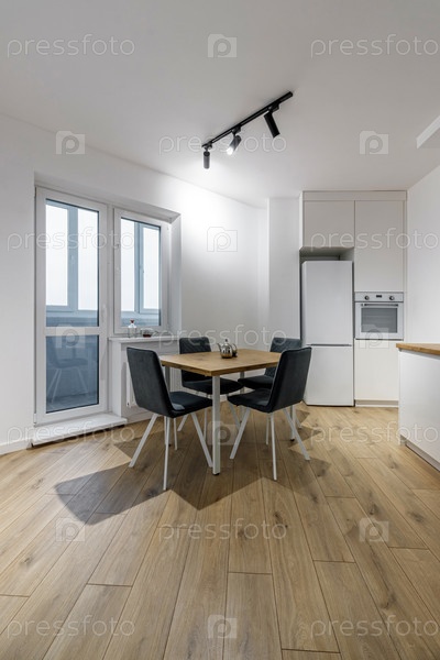 Современный интерьер кухни, деревянная мебель и стильный стол и стулья. Просторное и роскошное пространство в квартире
