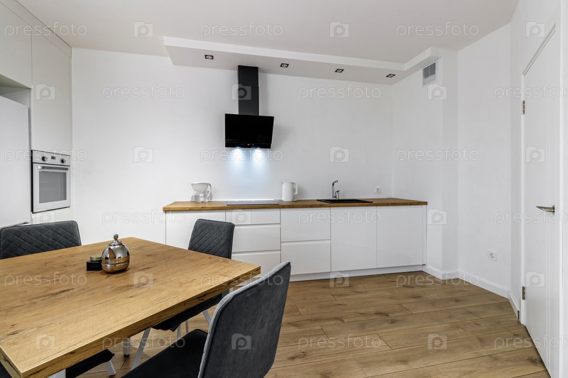 Современный интерьер кухни, деревянная мебель и стильный стол и стулья. Просторное и роскошное пространство в квартире