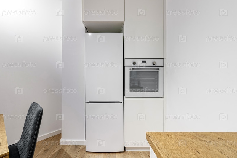 Взгляд современного интерьера кухни с белым холодильником и белой духовкой