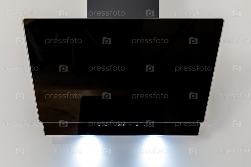 Крупный план современного интерьера кухни в белых и черных тонах с экстрактором крупным планом. Уютное место для приготовления пищи концепции. Современная бытовая техника
