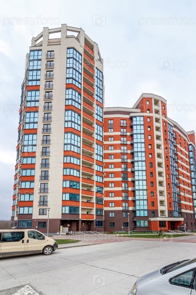 Детская площадка во дворе многоэтажного жилого дома на фоне голубого неба