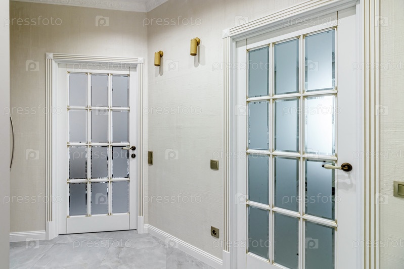 Интерьер стильного дома в светлых тонах с белыми дверями со стеклом