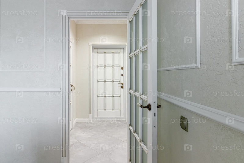 Интерьер стильного дома в светлых тонах с белыми дверями со стеклом