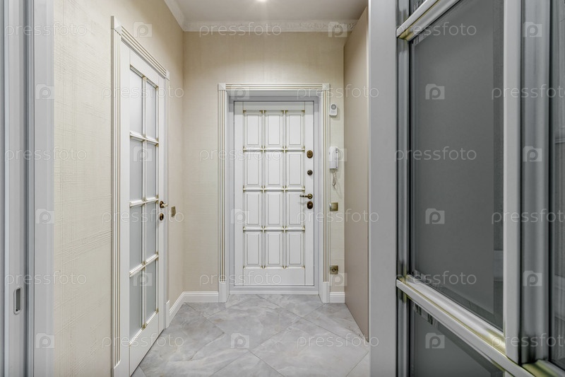 Интерьер стильного дома в светлых тонах с белыми дверями со стеклом