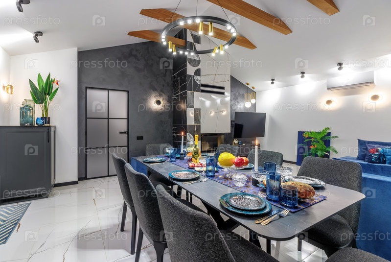 Современная гостиная с синим диваном и фиксированным столом. Потолок с деревянными балками. Открытое пространство