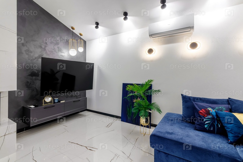 Современная гостиная с синим диваном и фиксированным столом. Потолок с деревянными балками. Открытое пространство