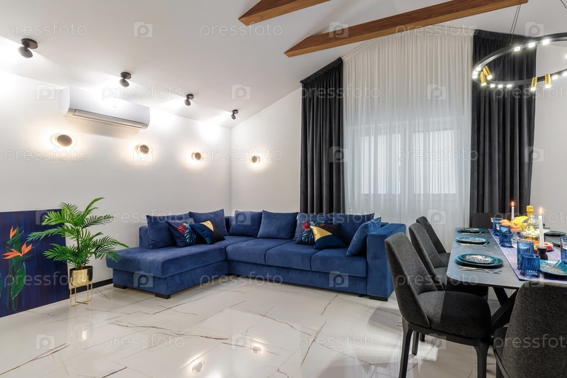 Современная гостиная с синим диваном и фиксированным столом. Потолок с деревянными балками. Открытое пространство