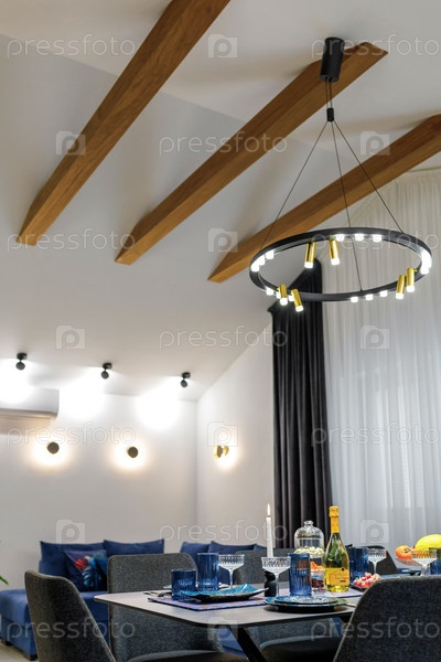 Современная гостиная с синим диваном и фиксированным столом. Потолок с деревянными балками. Открытое пространство