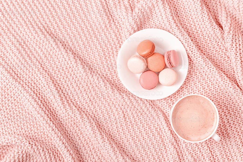 Фон с розовым пледом, кофе и миндальным печеньем