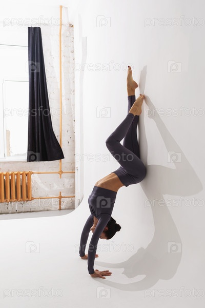Женщина, практикующая йогу, выполняющая упражнение Адхо Мукха Врикшасана с ногами на стене, стойкой на руках, перевернутой асаной