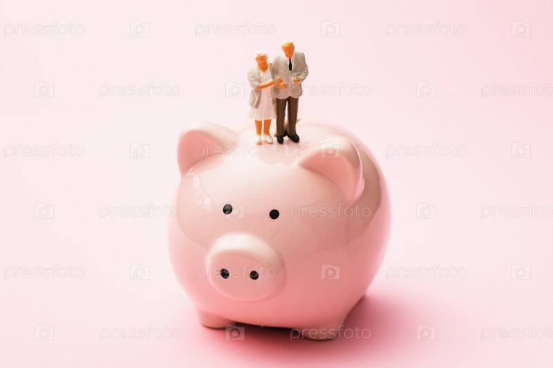 Игрушечные человечки из пластика стоят на копилке, концепция сбережения на старость