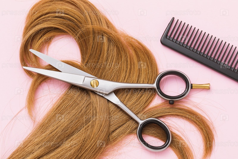 Ножницы, расческа и прядь вьющихся светлых детских волос женского пола на розовом фоне, вид сверху