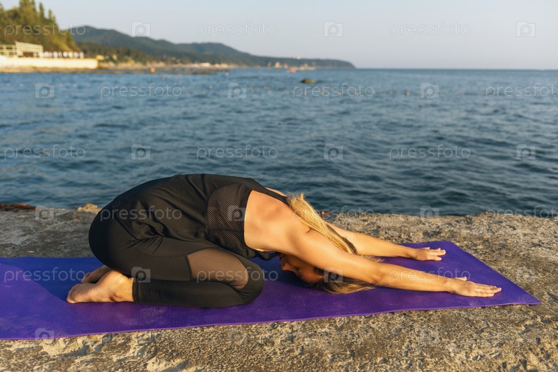 Женщина в спортивной одежде, занимающаяся йогой, на берегу моря солнечным летним вечером выполняет упражнение Баласана, позу для отдыха