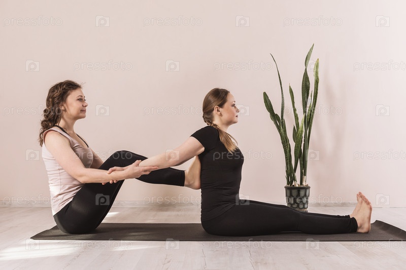 Учитель йоги выполняет разгибание позвоночника ученика, сидящего на коврике в студии у стены, техника улучшения осанки