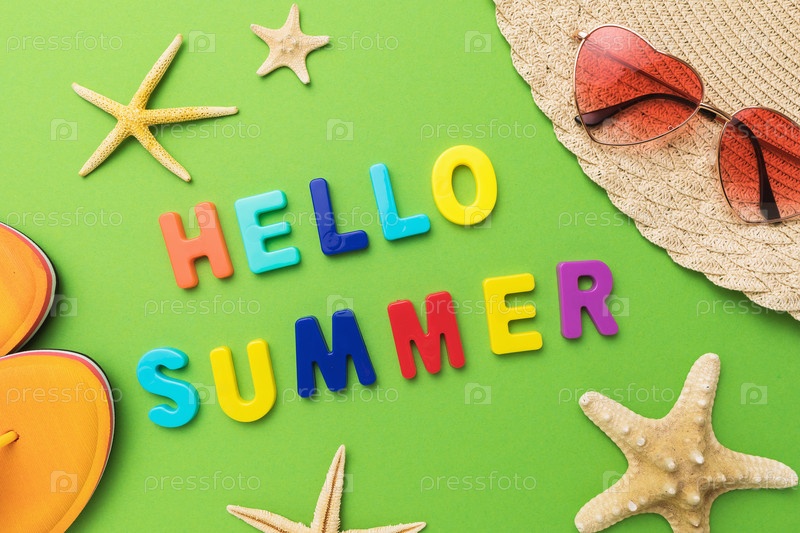 Надпись из разноцветных пластиковых букв в окружении аксессуаров для пляжного отдыха на зеленом фоне