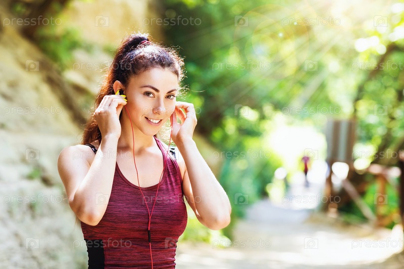 Молодая женщина в спортивной одежде слушает музыку в наушниках во время тренировки на улице