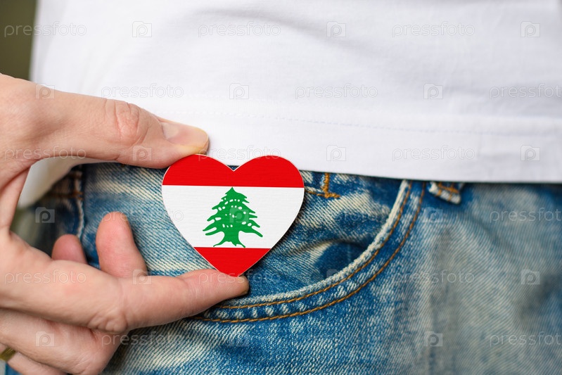 Деревянный значок с флагом Ливана в форме сердца в мужской руке