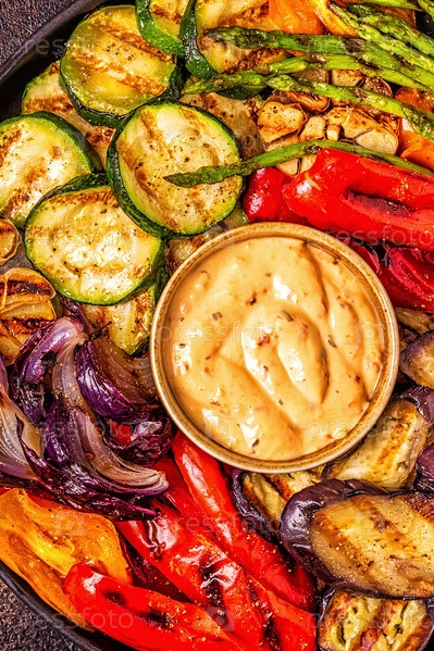 Жареные овощи на тарелке с соусом