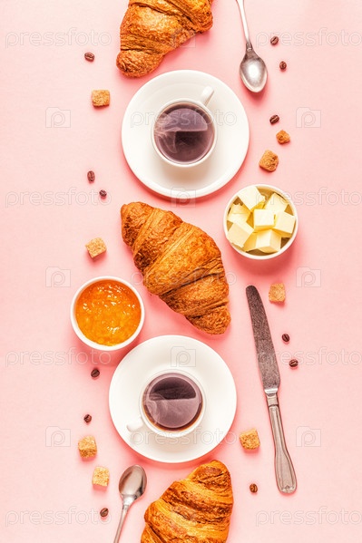 Кофе и круассаны на пастельном фоне