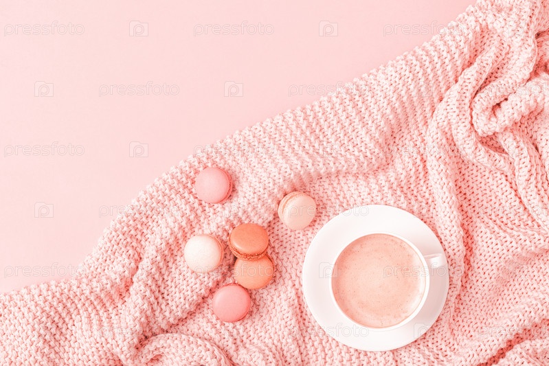 Фон с розовым пледом, кофе и миндальным печеньем