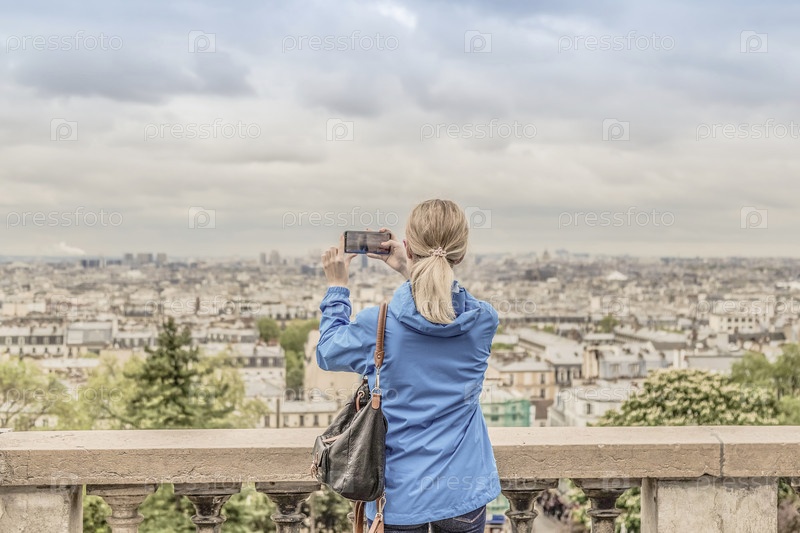 Женщина-турист фотографирует город в пасмурную погоду