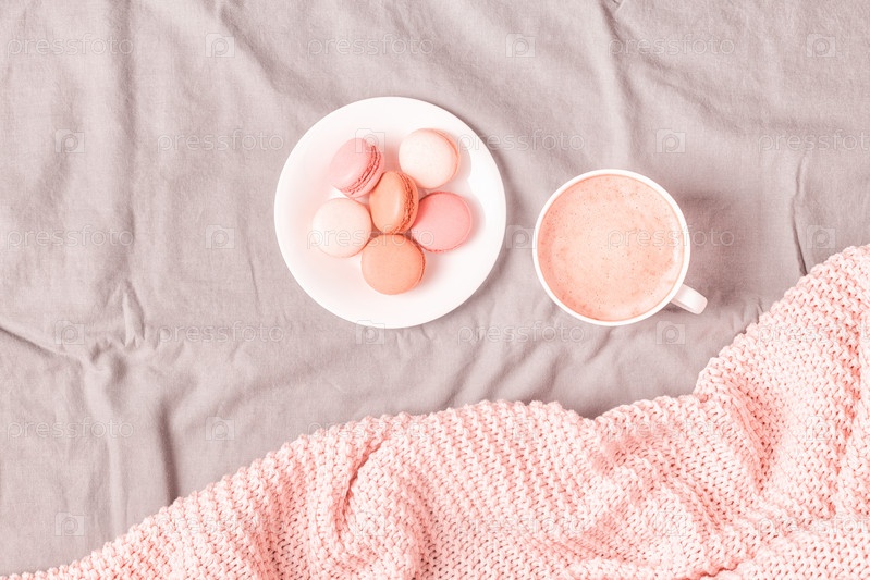 Кровать с розовым вязаным пледом, кофе и миндальным печеньем