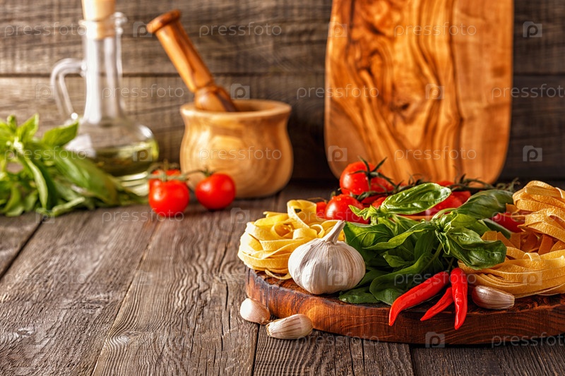 Продукты для приготовления пищи - макароны, помидоры, чеснок, перец и базилик