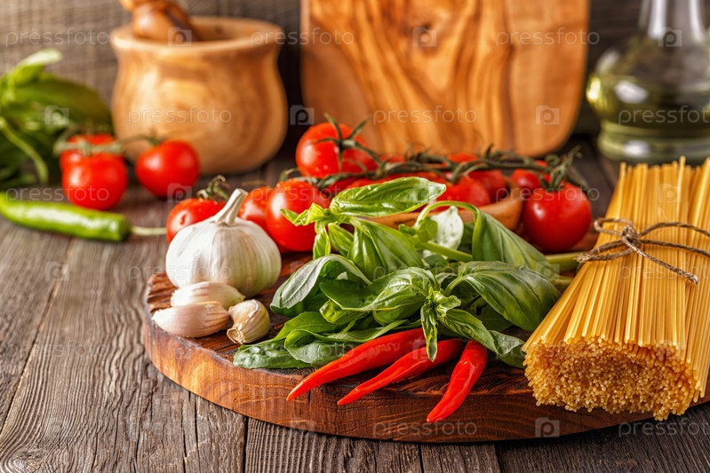 Продукты для приготовления пищи - макароны, помидоры, чеснок, перец и базилик