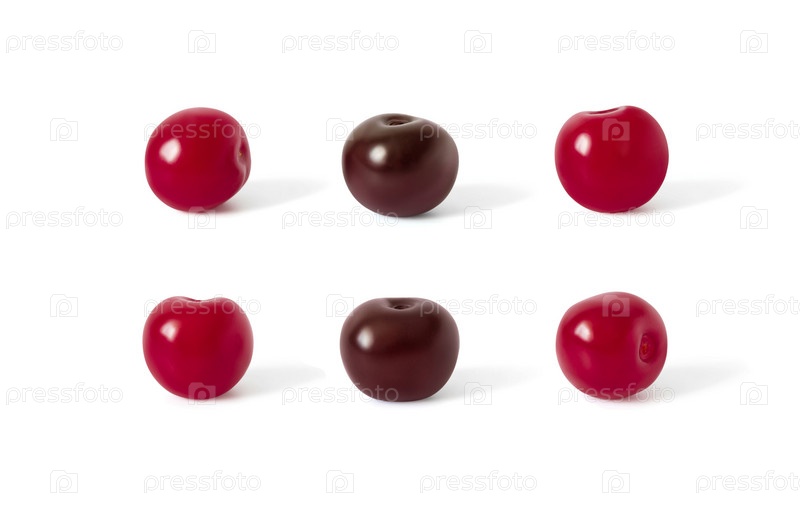 Спелые вишни, изолированные на белом фоне. Набор свежих ягод