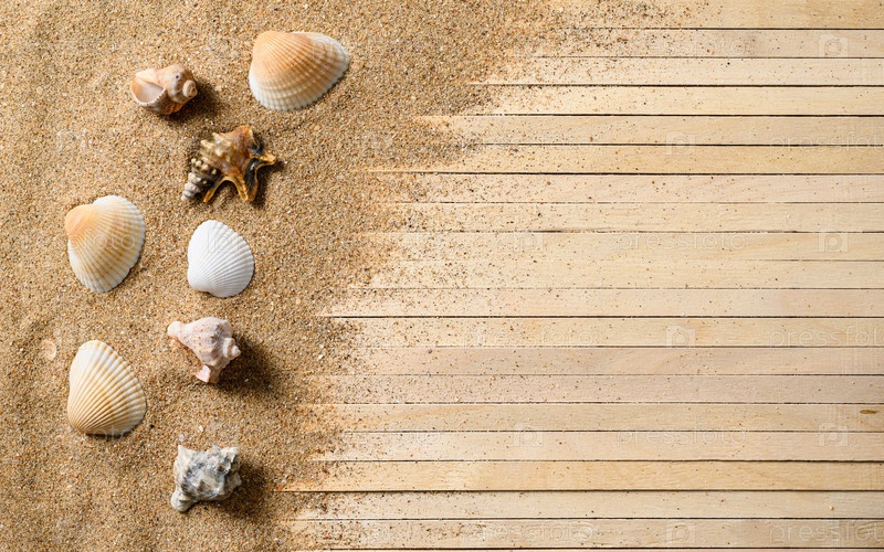 Ракушки и песок на деревянной палубе. Концепция отдыха на море. Селективный фокус на ракушках и песке