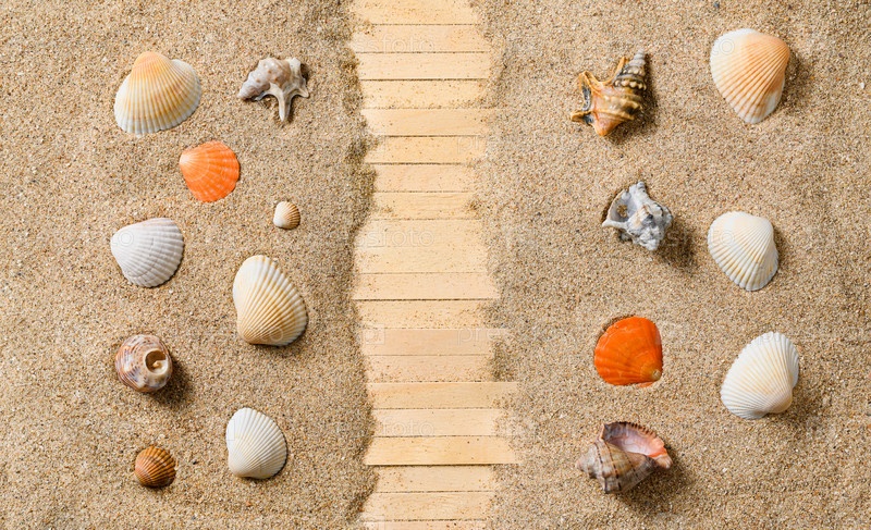 Деревянная дорога к морю на песчаном пляже с ракушками. Миниатюра. Вид сверху