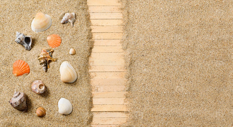 Летняя тема. Миниатюрный пляж с ракушками и деревянной дорожкой. Справа пустое свободное место в песке. Селективный фокус на ракушках и песке