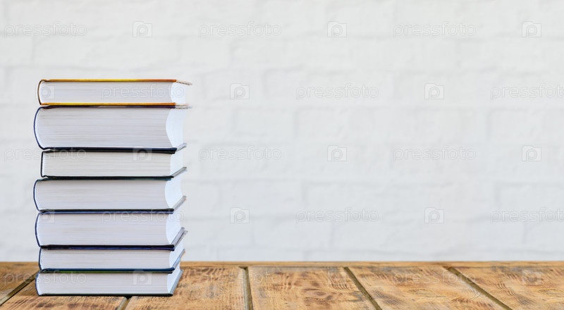 Стопка равномерно сложенных книг на старом деревянном столе на фоне светлого кирпича. копирайт. Концепция обучения