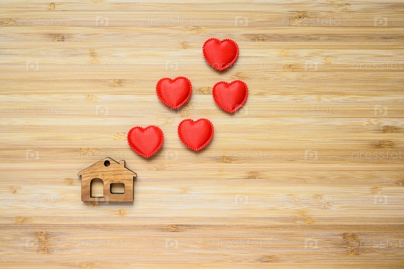 Красные сердечки над деревянной фигуркой игрушечного домика на деревянном фоне