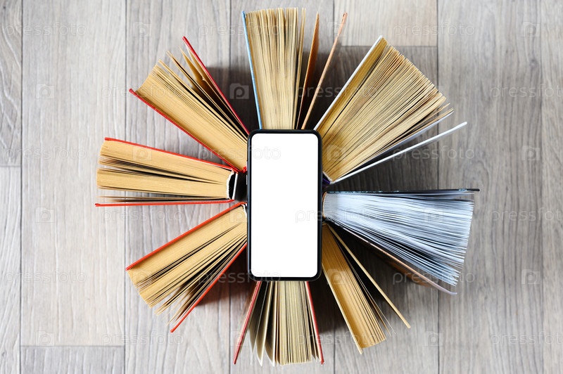 Смартфон с пустым белым дисплеем лежит на книгах. Вид сверху, макет