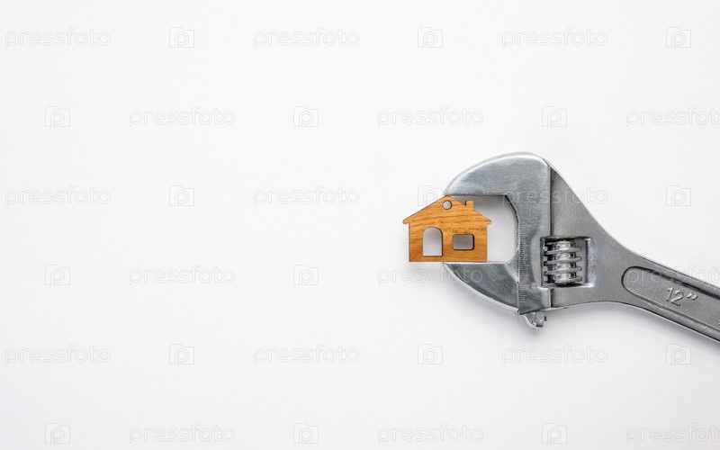 Небольшой дом зажат гаечным ключом на белом фоне. Покупка или строительство концепции дома