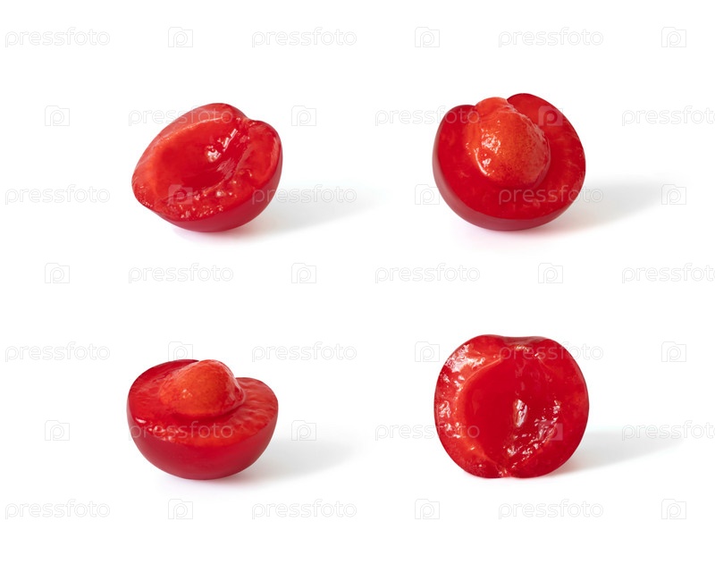 Набор нарезанных вишен, изолированные на белом фоне
