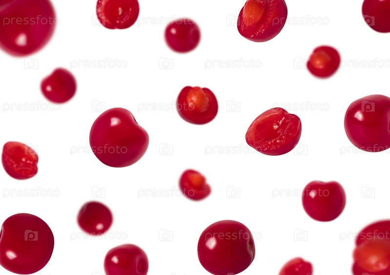 Нарезанные и целые падающие вишни изолированы на белом фоне. Летающая вишня. Ягодный узор