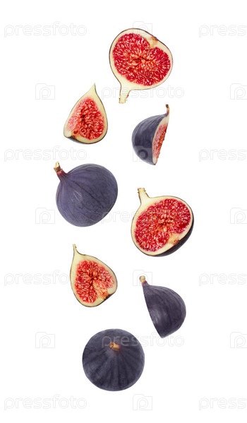 Падение инжира, изолированные на белом фоне. Летающие фрукты для дизайна упаковки. Летающие фиги. Здоровая натуральная пища