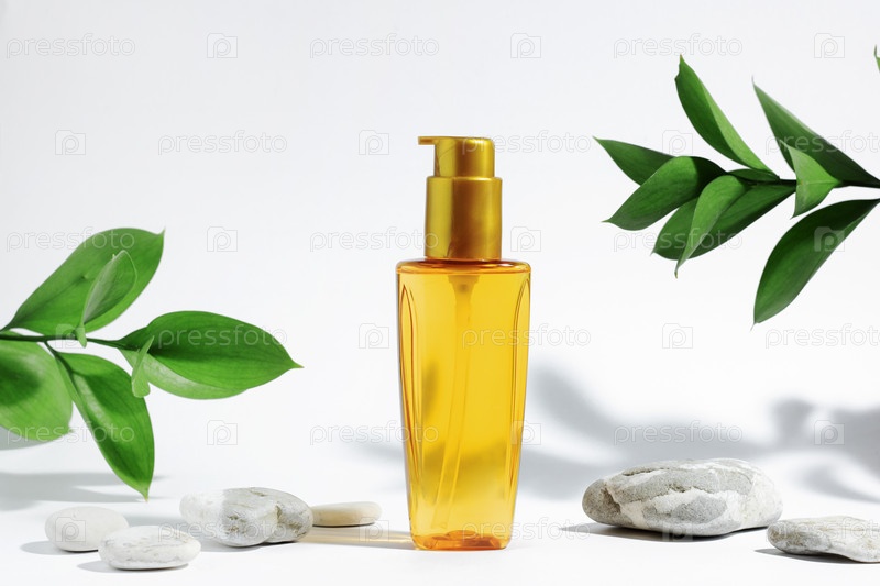 Прозрачная бутылка масла желтого апельсина для защиты от солнца, загара или волос. Белый фон с жесткими тенями, растениями и камнями. Косметика для летнего ухода