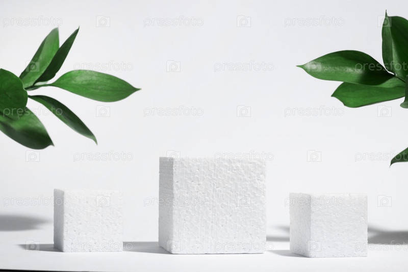 Белый пористый куб, квадратный подиум с листьями и тенями на бело-сером фоне. Концептуальная сцена, витрина для нового продукта, презентация, продажа, реклама, баннер, косметика. С копией пространства