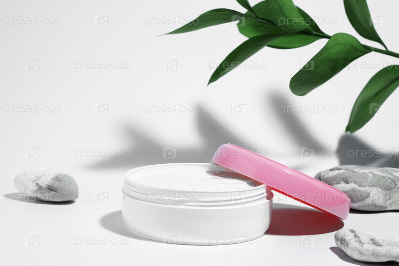 Белая банка лекарственного питательного и увлажняющего крема для лица с розовой крышкой, изолированной на белом фоне с тенью ветки растений и экологическими камнями. Концепция ухода за кожей. Копировать пространство
