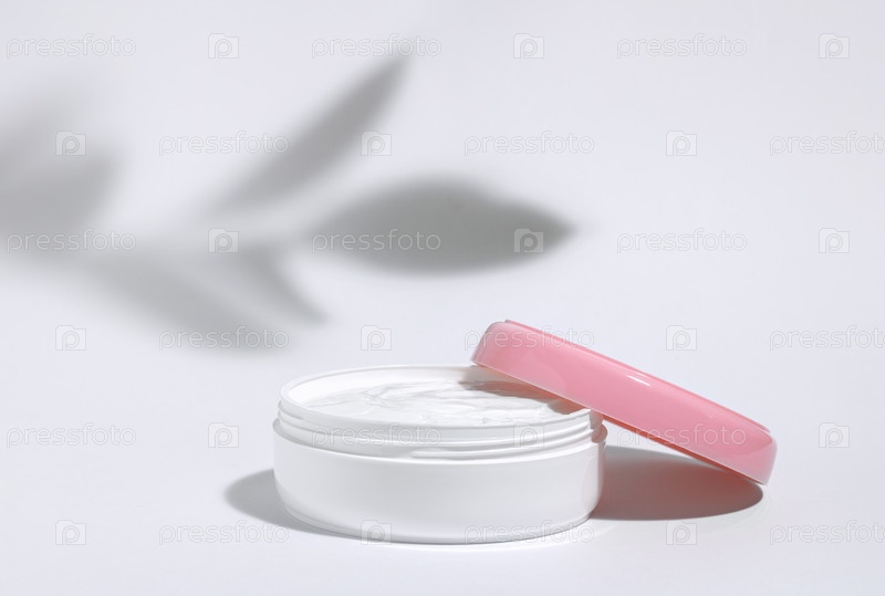 Фон косметический. Белая банка увлажняющего крема для лица с розовой крышкой на белом фоне с тенью от ветки растения. Косметология или концепция ухода за кожей. Копировать пространство