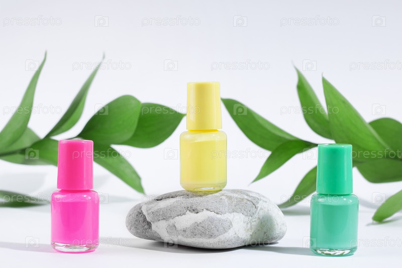 Коллекция цветных лаков для маникюра на подиуме, на белом фоне, с жесткими тенями и листьями. Креативный макет изолированной косметической бутылки с желтым, зеленым и розовым лаком для ногтей