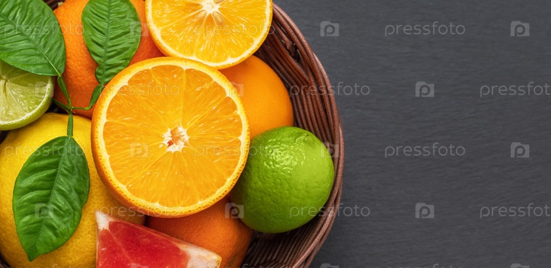 Цитрусовые в корзине на фоне серого камня крупным планом. Смесь цитрусовых. Апельсин, лимон и лайм с листьями. Баннер. Скопируйте пространство, вид сверху, плоская планировка