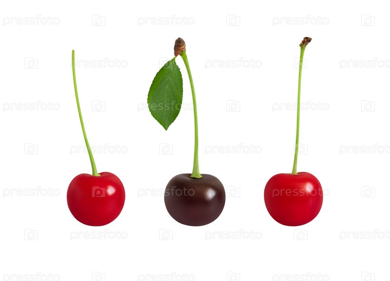 Красные и фиолетовые вишни, изолированные на белом фоне. Вишневый набор. Свежие сочные ягоды