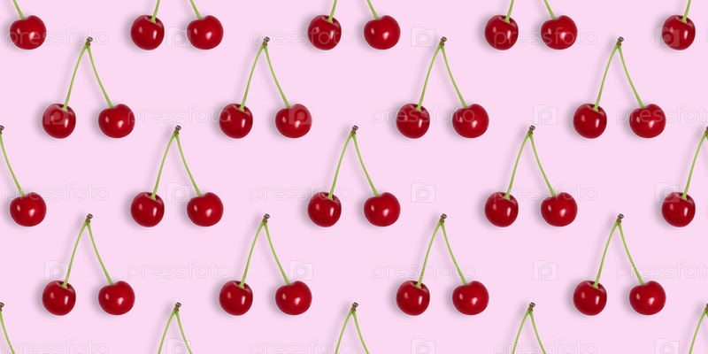 Бесшовный узор с вишней на розовом фоне. Бесшовные текстуры вишни для дизайна. Ягодный летний фон. Вид сверху, плоская планировка. Баннер
