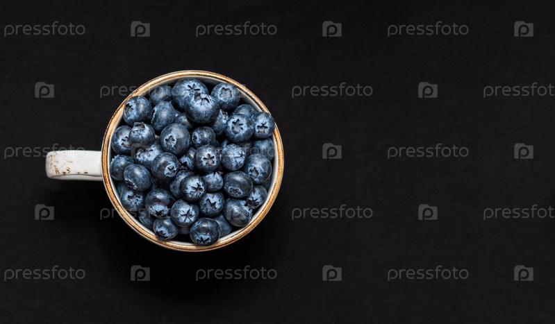 Черника в чашке на черном фоне. Сочная свежая черника. Баннер. Скопируйте пространство, вид сверху, плоская планировка