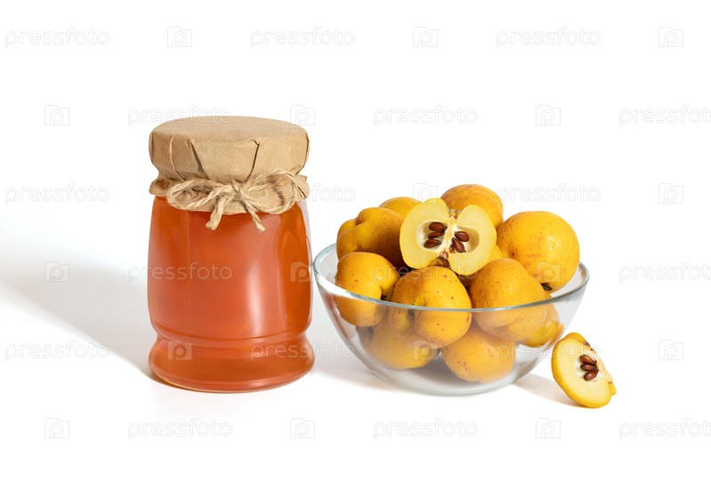 Варенье из айвы. Банку варенья и айвы в миску, изолированные на белом фоне